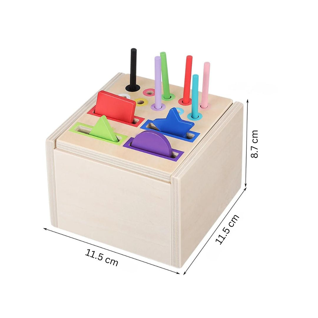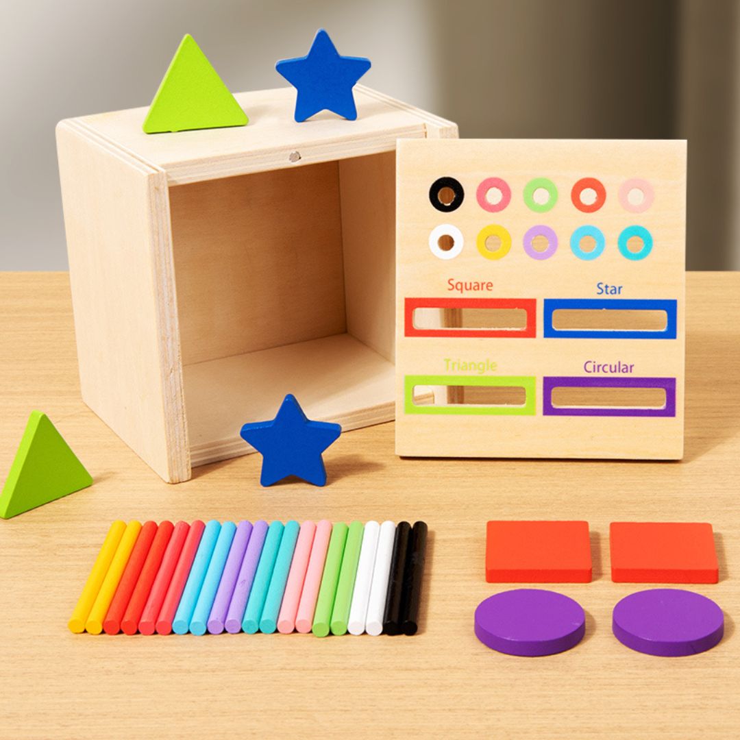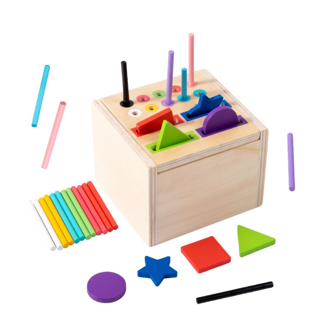 Inspirat din pedagogia Montessori, acest cub educativ din lemn este o soluție 2 în 1, combinând sortarea formelor și a culorilor cu activități de numărare pentru a stimula logica și motricitatea fină într-un mod natural și distractiv.
