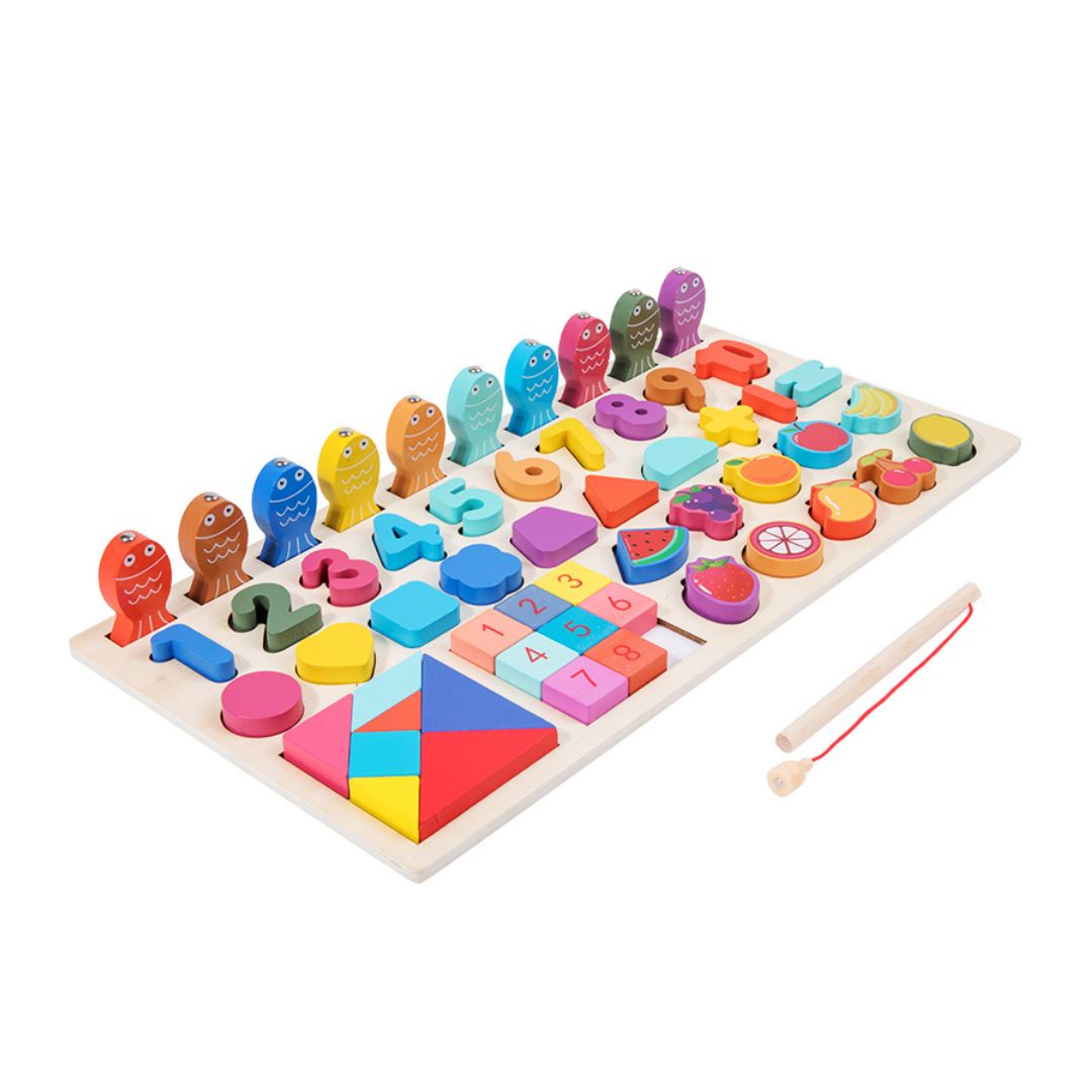 Acest joc educațional multifuncțional din lemn este conceput pentru a stimula dezvoltarea abilităților cognitive și motorii ale copiilor.