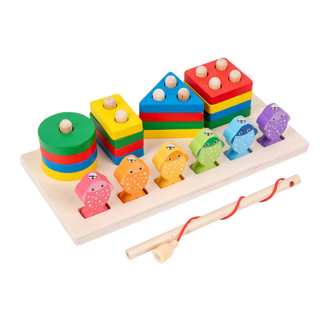 16 Piese geometrice de diferite forme (cerc, pătrat, triunghi, dreptunghi) și culori, care pot fi stivuite și potrivite pe tije.