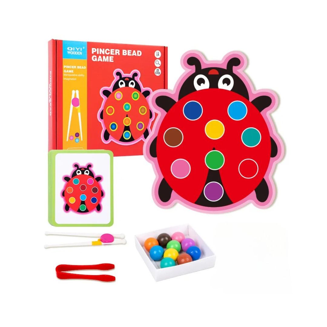 Cu ajutorul pensetei copilul prinde și potriviște mărgelele colorate în locurile corespunzătoare de pe tabla de joc, respectând modelele de pe cardurile față-verso. Această activitate îmbunătățește dexteritatea, precizia mișcărilor și recunoașterea culorilor.