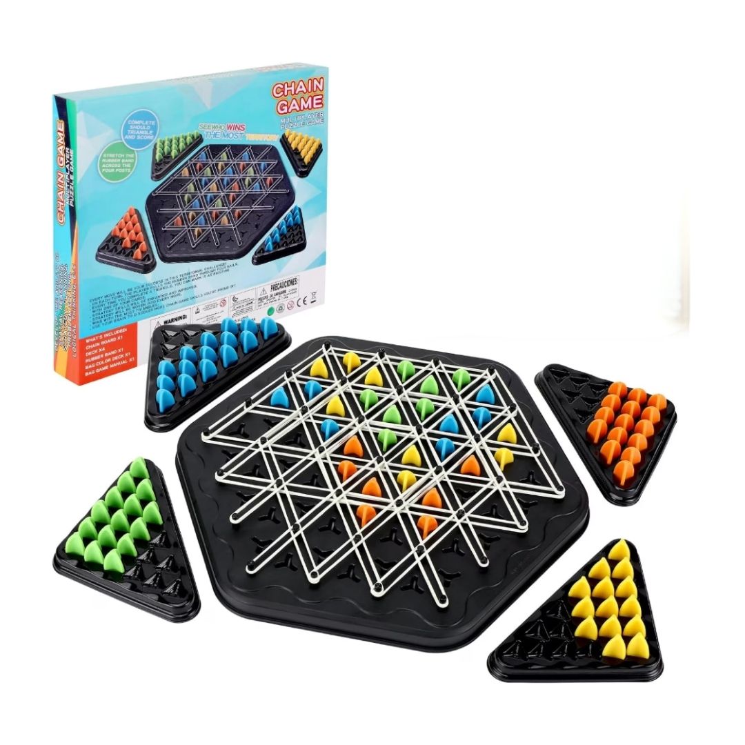 Un joc educativ și captivant pentru copii și adulți, care îmbină logica, strategia și distracția. Cu ajutorul benzilor elastice, jucătorii formează triunghiuri pe tablă și își plasează piesele colorate, încercând să obțină cât mai multe forme. Este un joc de familie perfect, care dezvoltă gândirea logică, atenția și spiritul competitiv.