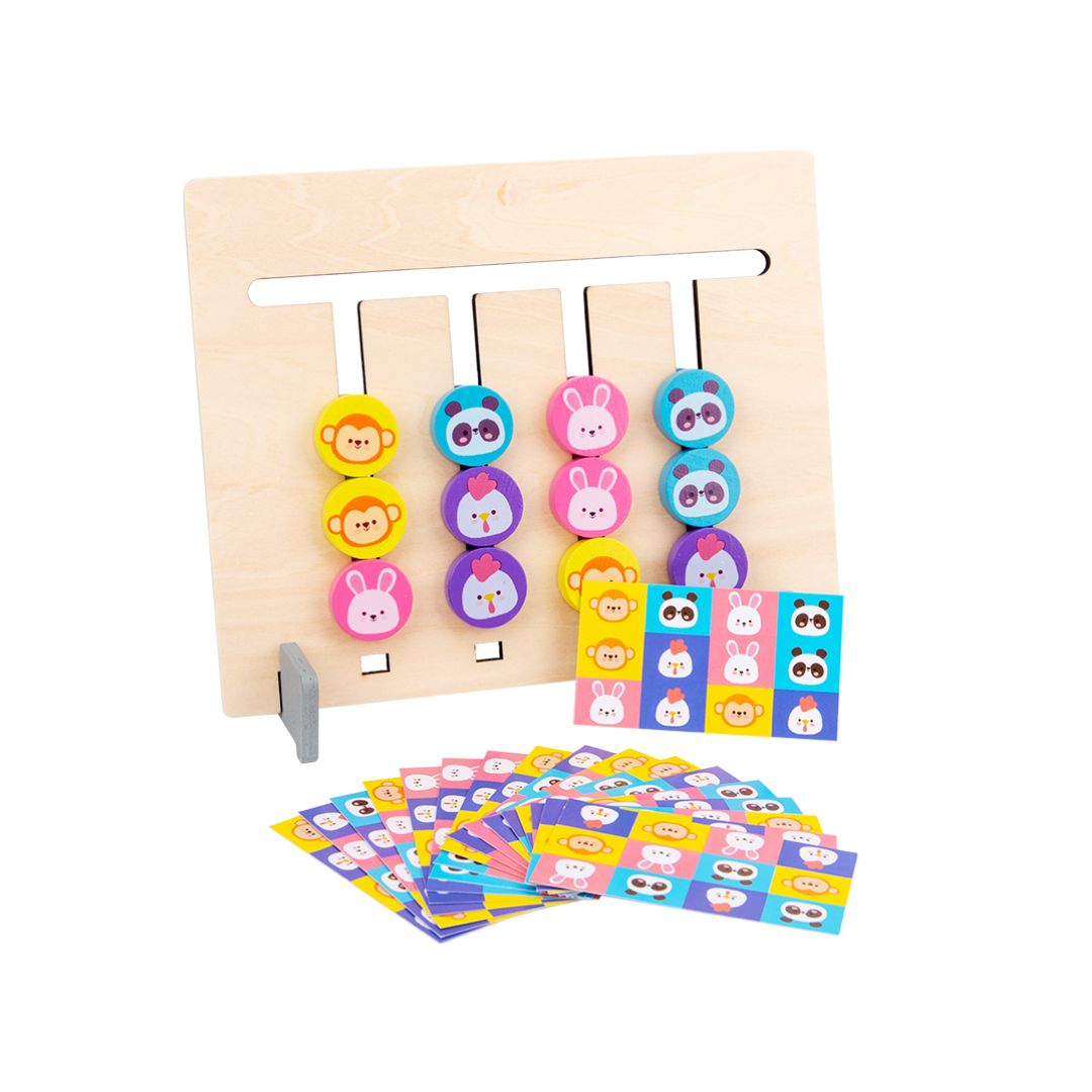 Acest set include un suport din lemn dotat cu piese rotunde mobile. Piesele sunt ilustrate cu culori pe o parte și animale pe cealaltă, oferind multiple posibilități de joc.