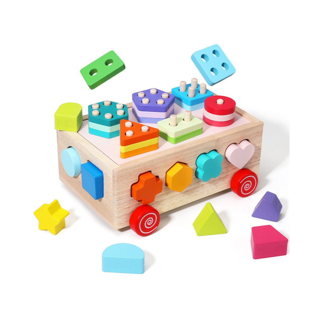 Jucăria conține o cutie din lemn pe roți cu găuri pentru forme geometrice, 14 piese colorate de diferite forme, 6 forme de stivuit și roți decorative pentru joacă mobilă.
