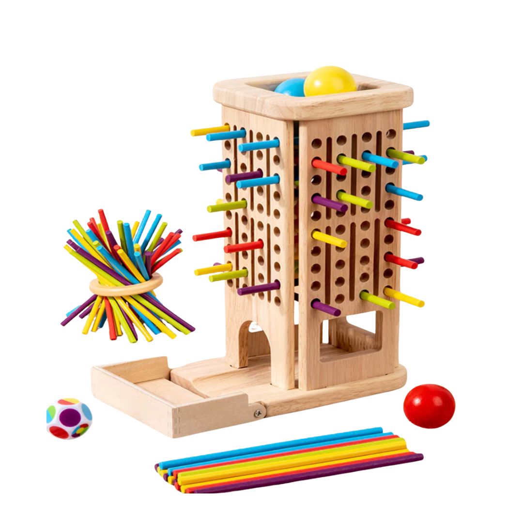 Uită de jocurile care plictisesc! Acest turn din lemn este o provocare pentru toate vârstele. Gândește-te la el ca la un „laborator” de strategie și îndemânare: copilul învață să potrivească bețișoarele cu precizie, anticipează cu emoție traseul bilelor și analizează fiecare mișcare pentru a nu dărâma structura. Este genul de joc care transformă o seară obișnuită într-o competiție de familie.